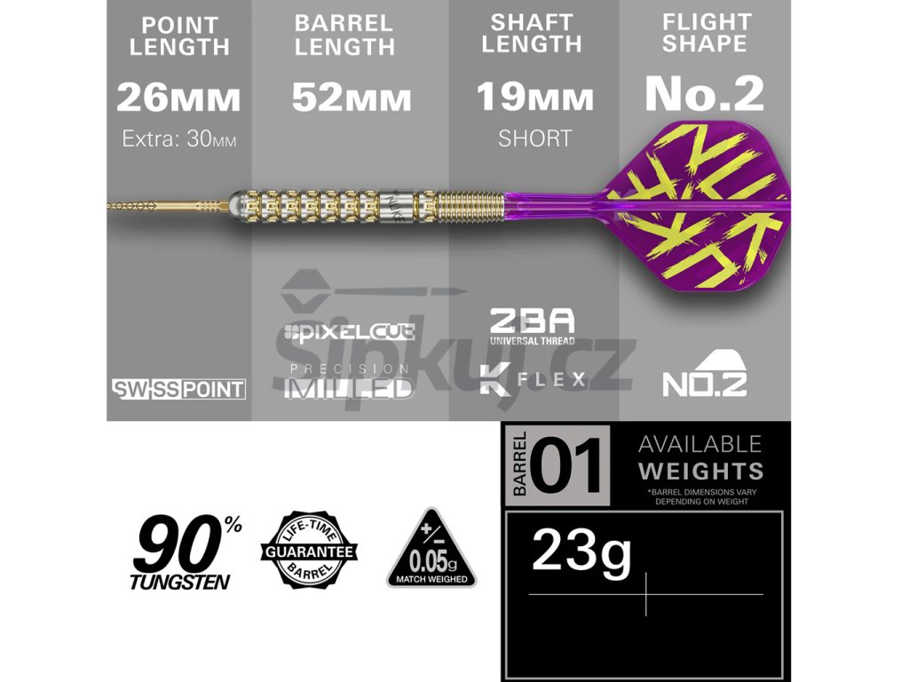23g barrely o délce 52 mm a průměru 6,5 mm představují ideální kombinaci pro hráče, kteří hledají rovnováhu mezi stabilitou a dynamikou hodu.